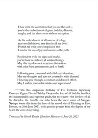W tym pomyślnym dniu urodzin Jego Świątobliwości Gjalłanga Karmapy Ogjena Drodula Trinle Dordże – Pana wszystkich Rodzin Buddy, niezrównanego i niedościgłego Przewodnika, Rdzennego Lamy – najmarniejszy z jego uczniów, noszący z pokorą samo imię Sangje Njenpy, skreślił te słowa u stóp sanktuarium Taktsangu w Paro, w Bhutanie, 26 czerwca 2021 roku, z głębi serca modląc się całym sobą."