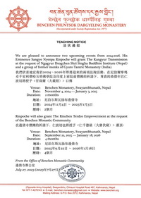 В ответ на просьбу непальского Буддийского Института Нгагьюр Дзогчен Шри Сингха, а также группы монахов из индийского монастыря Гьюто, Друбванг Сангье Ньенпа Ринпоче дарует передачу лунга к Кангьюру, а также цикл абхишек «Ринчен Тердзо».
