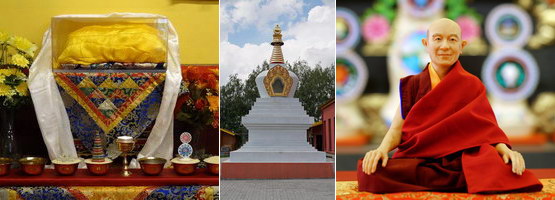 На фотографиях слева: одежды Кьябдже Тенги Ринпоче, ступа с реликвиями в Грабнике, статуэтка – копия Ринпоче.